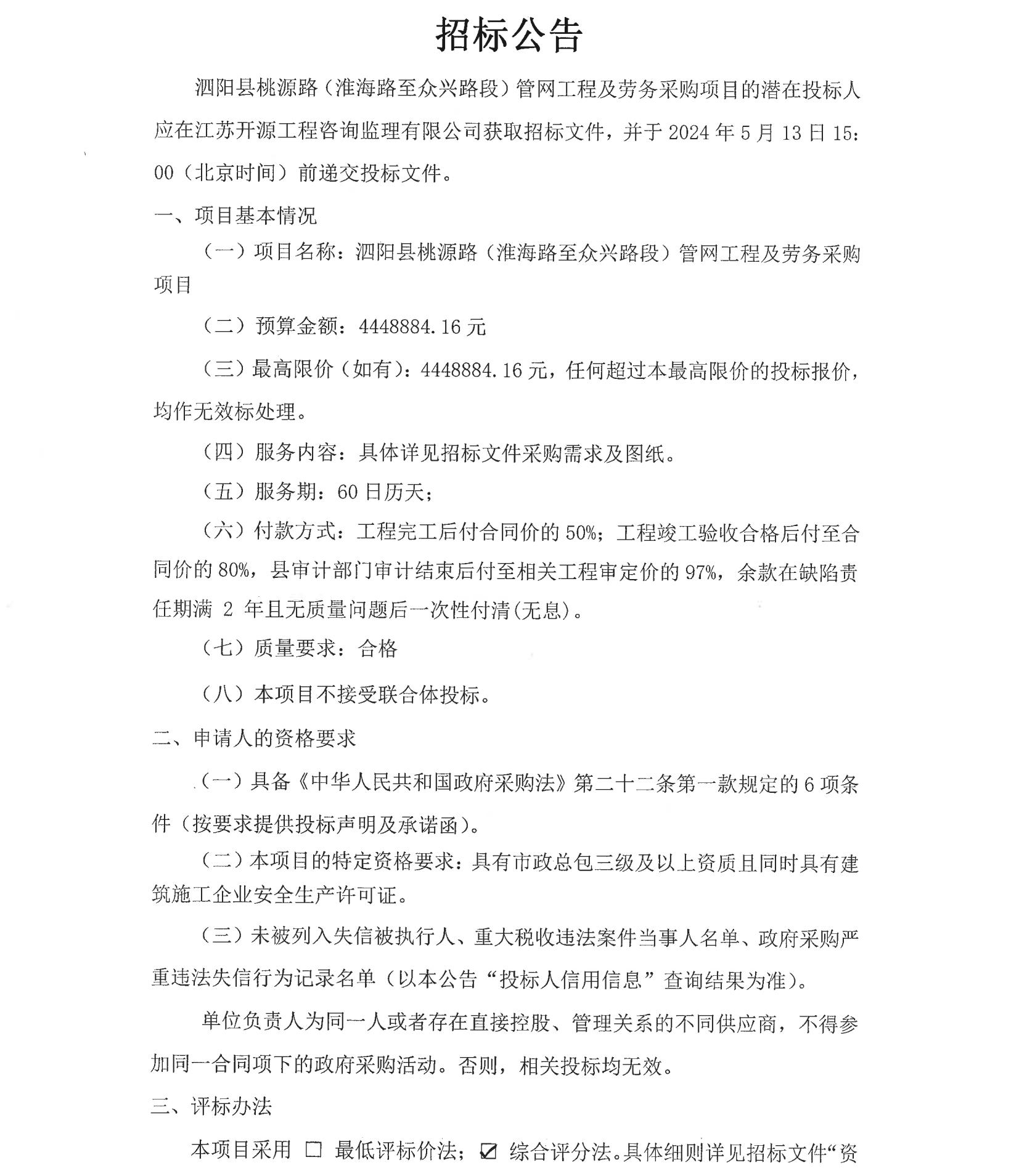泗陽(yáng)縣桃源路(淮海路至眾興路段)管網(wǎng)工程及勞務(wù)采購(gòu)項(xiàng)目招標(biāo)公告