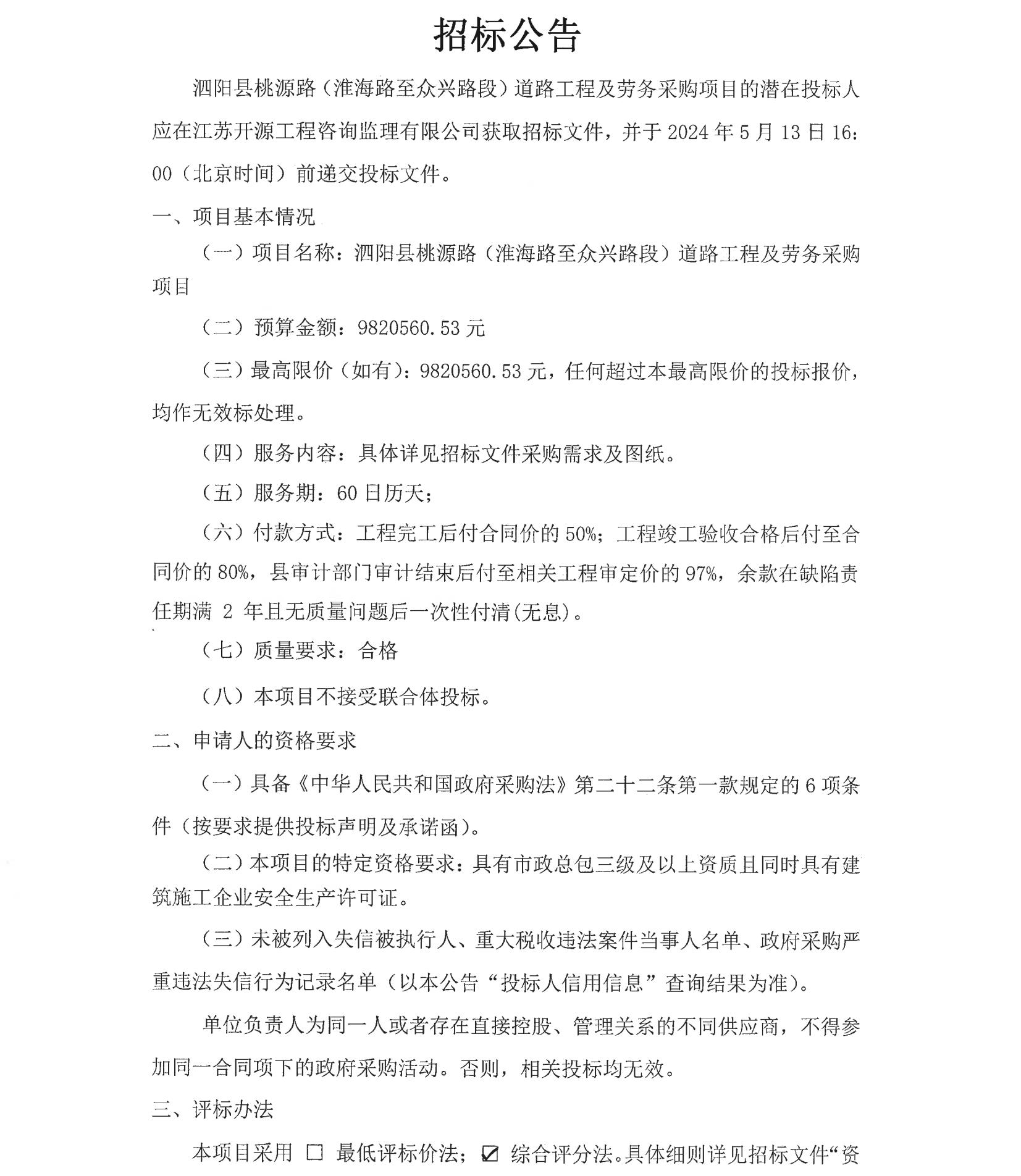 泗陽縣桃源路(淮海路至眾興路段)道路工程及勞務(wù)采購項(xiàng)目招標(biāo)公告