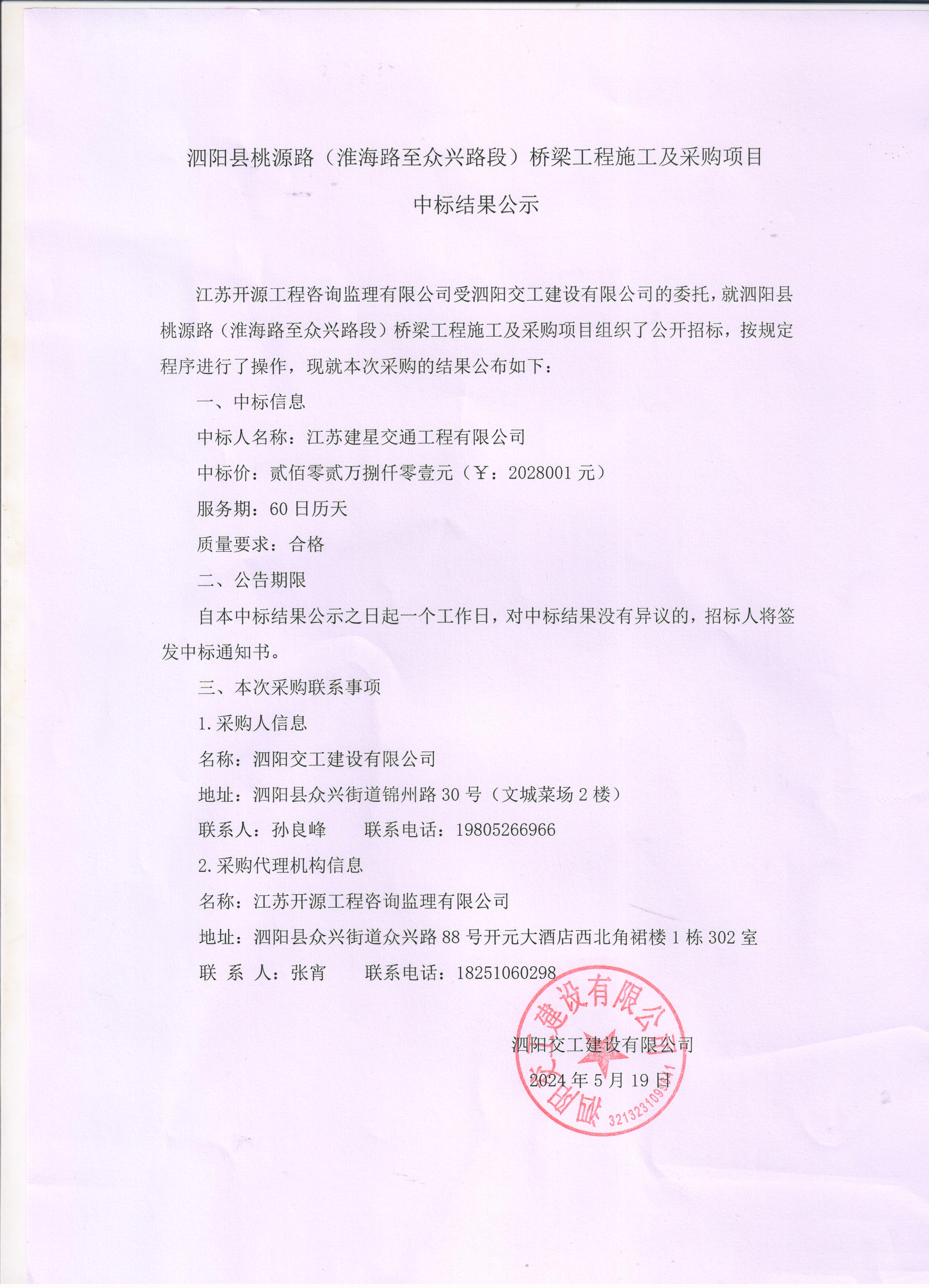 泗陽(yáng)縣桃源路(淮海路至眾興路段)橋梁工程施工及采購(gòu)項(xiàng)日中標(biāo)結(jié)果公示